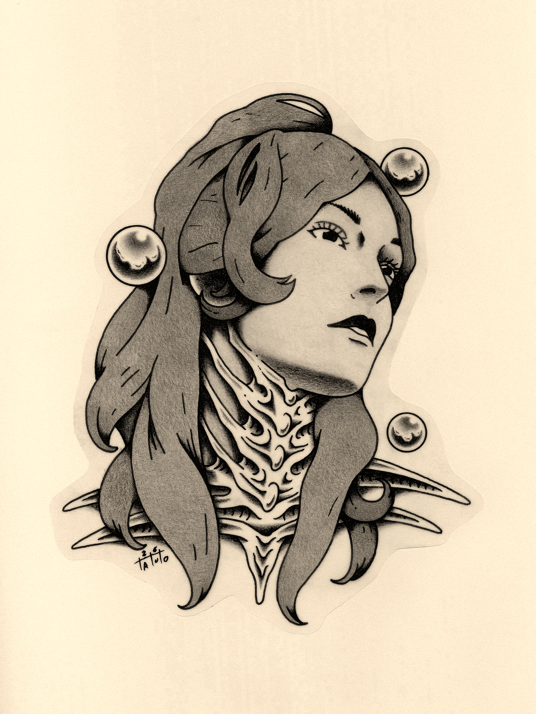 Tattoo Flash Neotrad d’un portrait de femme biomeca disponible pour un tattoo, en couleur ou noir et gris chez Anyway77 à Talence près de Bordeaux.